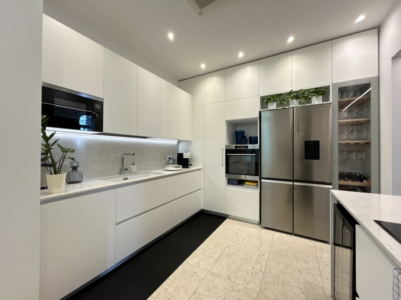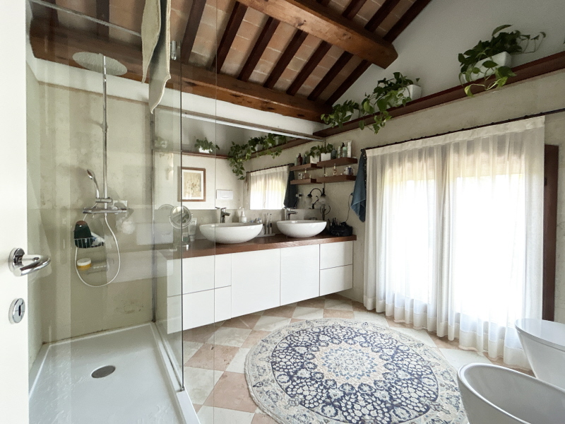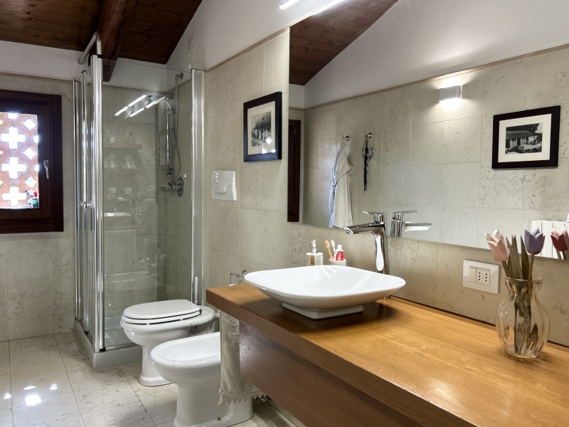 Al primo piano, tre camere da letto, ciascuna con bagno privato. A completare la zona notte, un soppalco che regala spazio e versatilità.